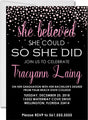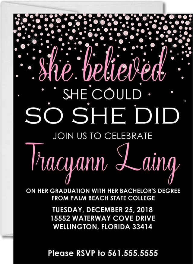 These girls graduation party invitation cards feature a pastel pink border of diamond confetti along the top of the cards along with the phrase She Believed She Could So She Did against an all black background. The invitation cards are personalized with the graduates name and the special event details in two pastel pink and white font styles.