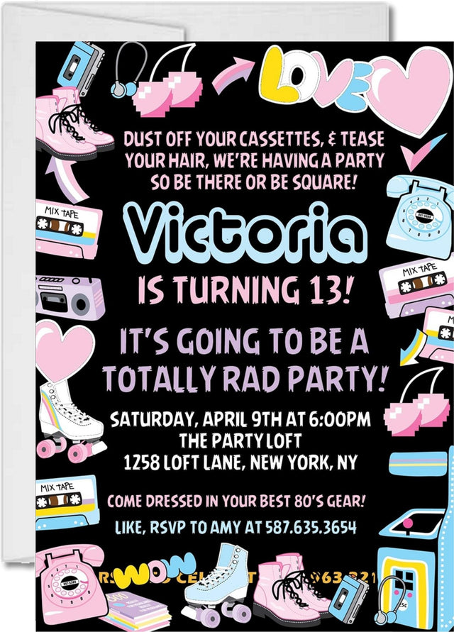 These fun and colorful 1980's themed birthday party invitations features a border of signature pastel items from the 80's decade designed against a black background and are personalized with your event details fun and colorful font styles.